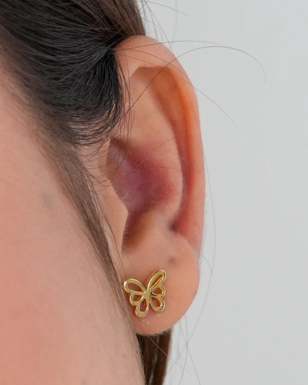 🦋 “Ligero y femenino, el arete Butterfly simboliza libertad y belleza. Oro laminado premium con detalles delicados.”