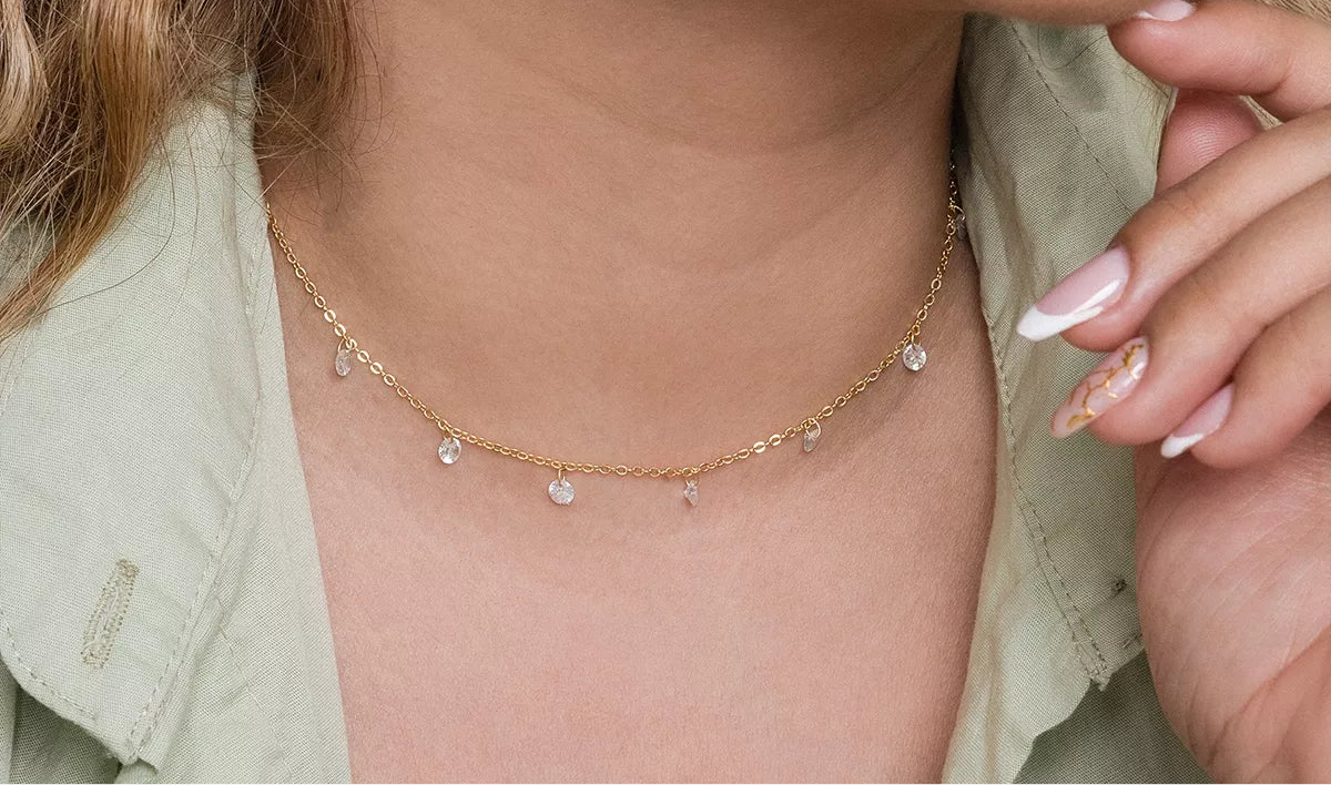 Brillo impecable 💎, diseño cercano al cuello ✨ perfecto para combinar con cadenas más largas y crear un look sofisticado.