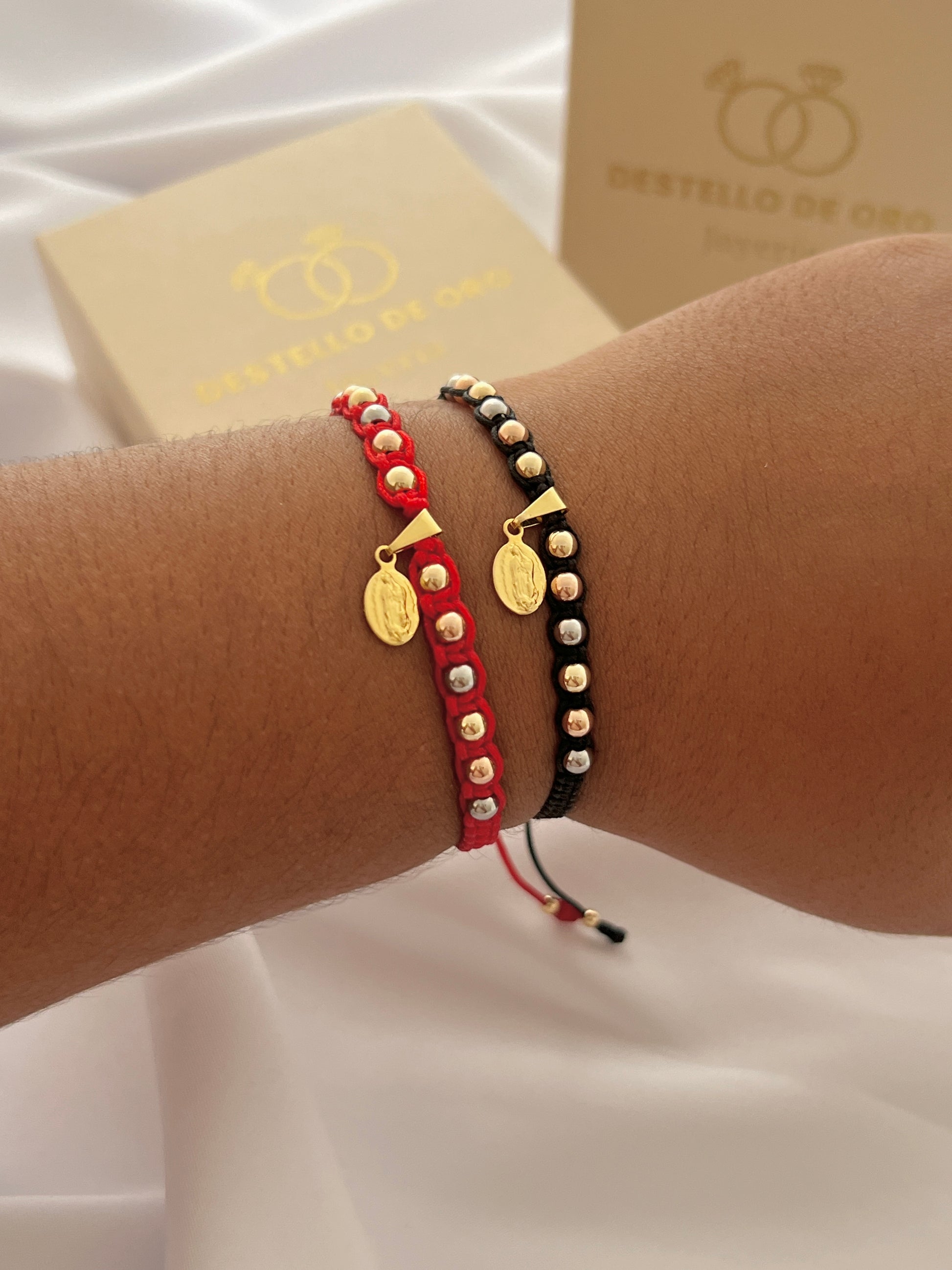 Pulseras tejidas elaboradas con | 12 balines tres oros #4 | Dije virgen Guadalupe centrada | Hilo fino resistente al agua & uso diario.