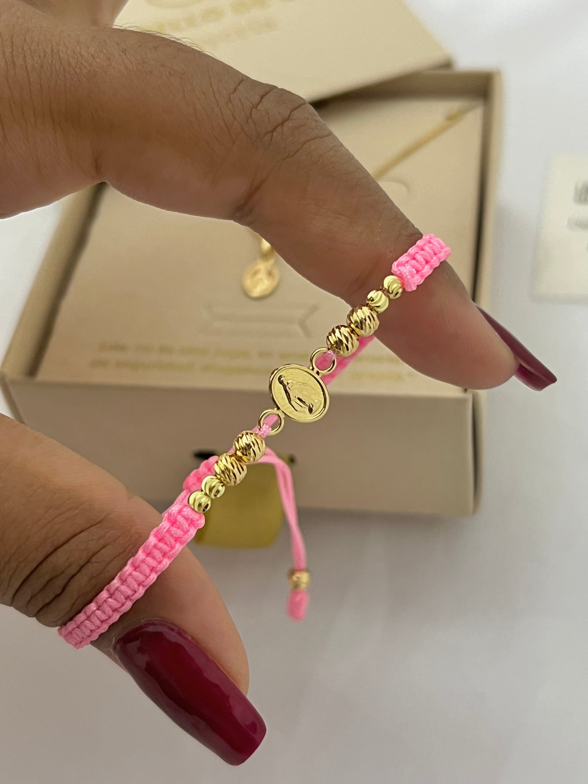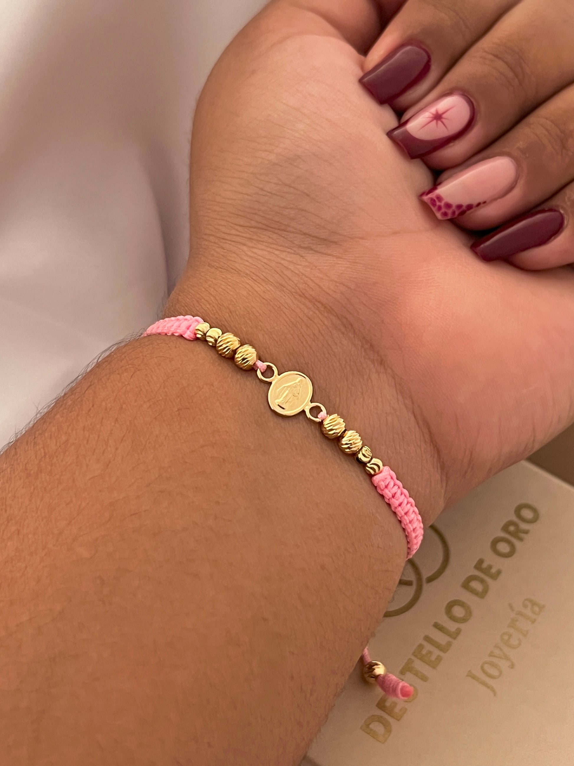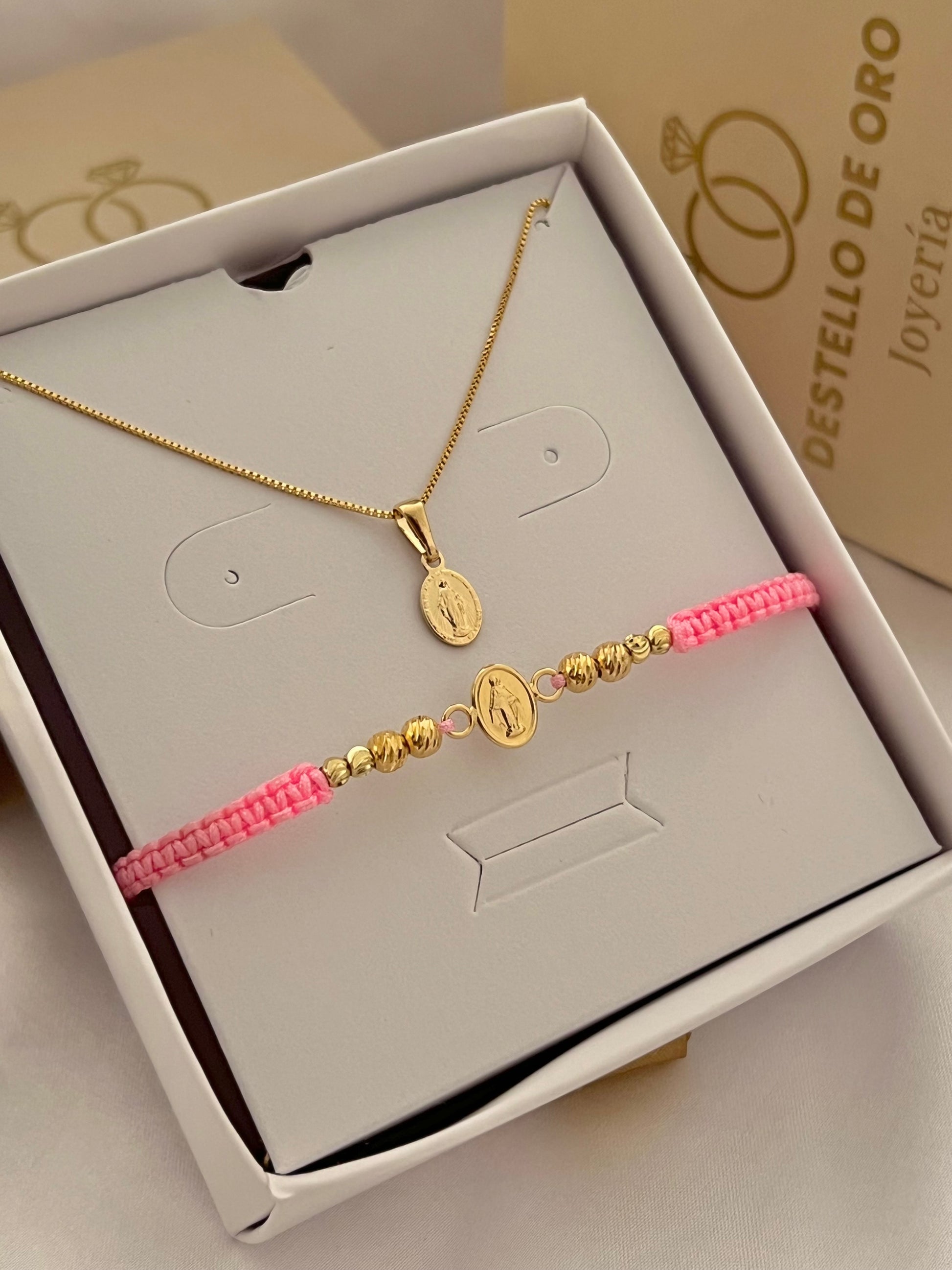 Exclusivo set compuesto por cadena de 45 Centímetros de largo | Dije Virgen Milagrosa | Pulsera tejida rosa con finos balines italianos.