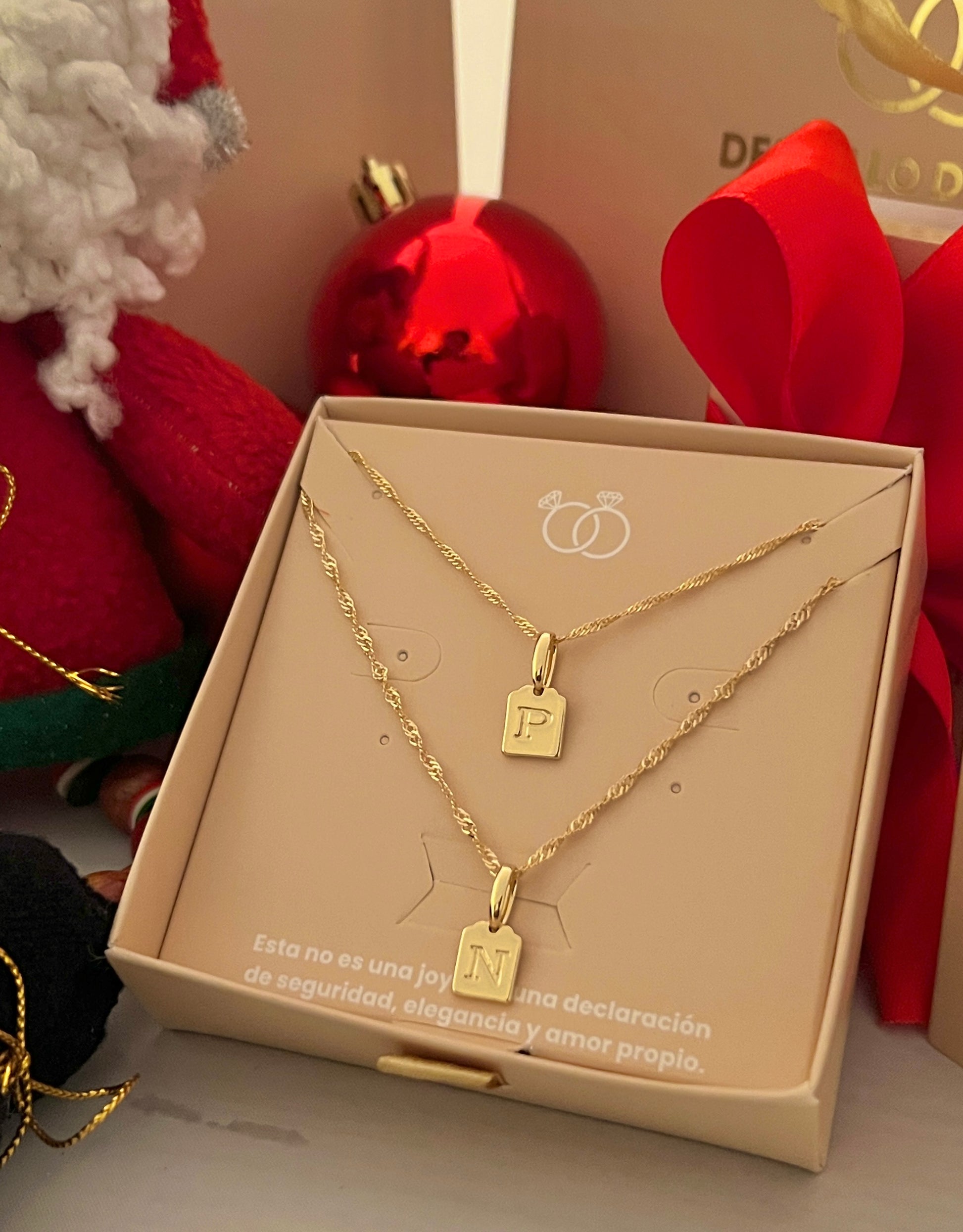 🤎 Dúo Inicial Placa | 1 Cadena de 50 centímetros de largo | Otra Cadena de 60 centímetros de largo + 2 dijes de inicial placa