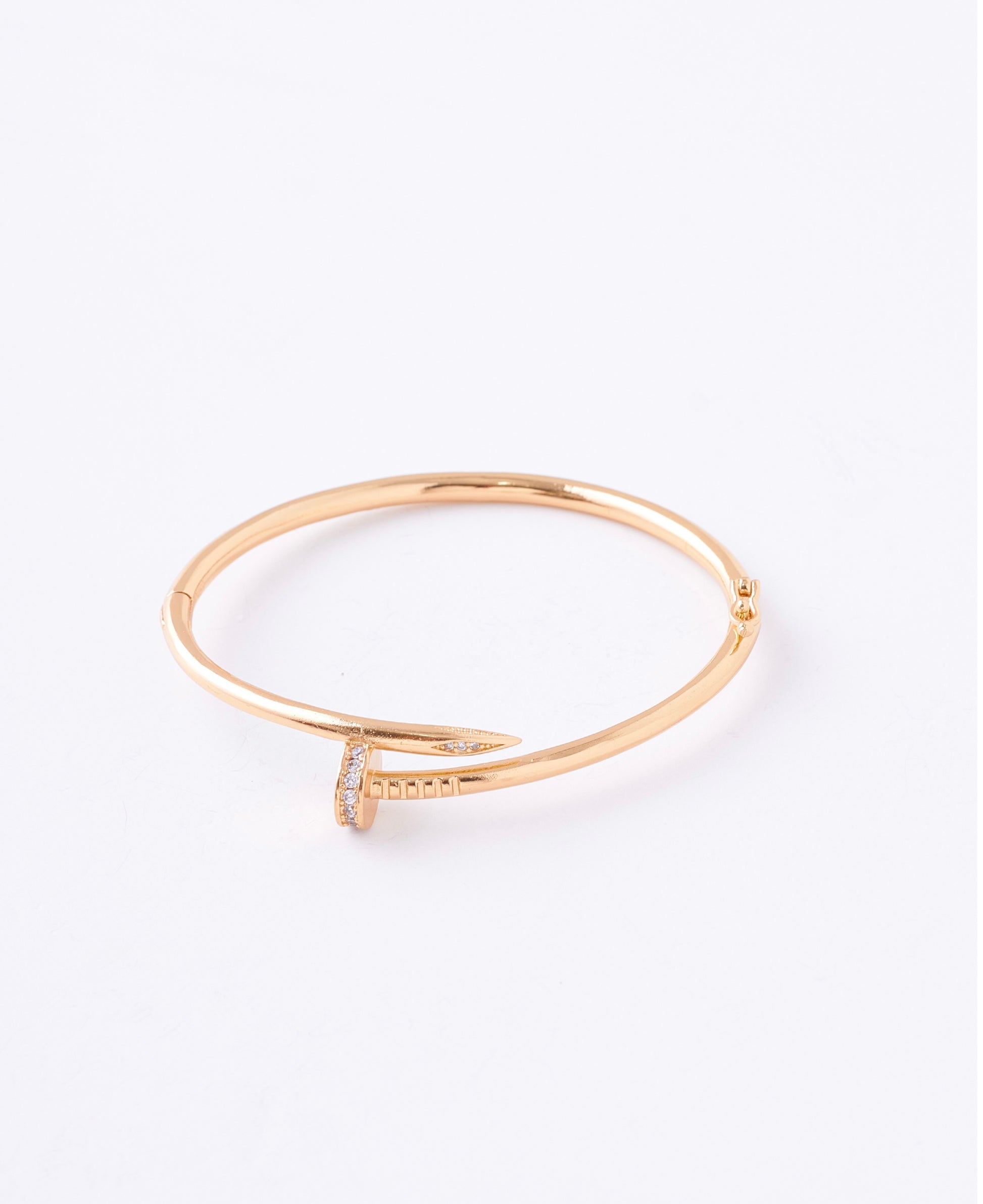 Diseño rígido tipo bangle con forma “clou” elegante, terminado en oro laminado 18K de alta calidad; estiliza tu muñeca con un toque moderno y sofisticado.