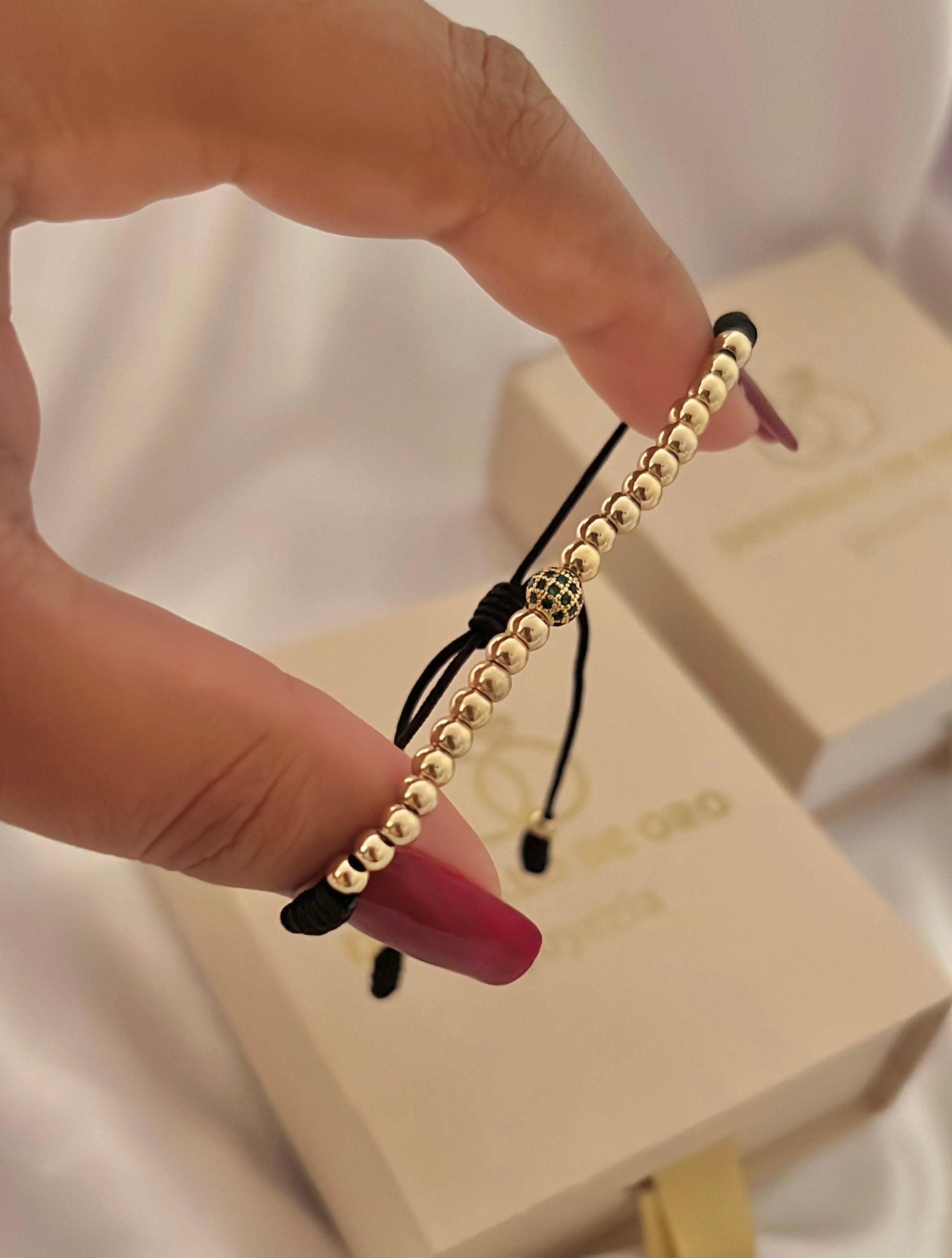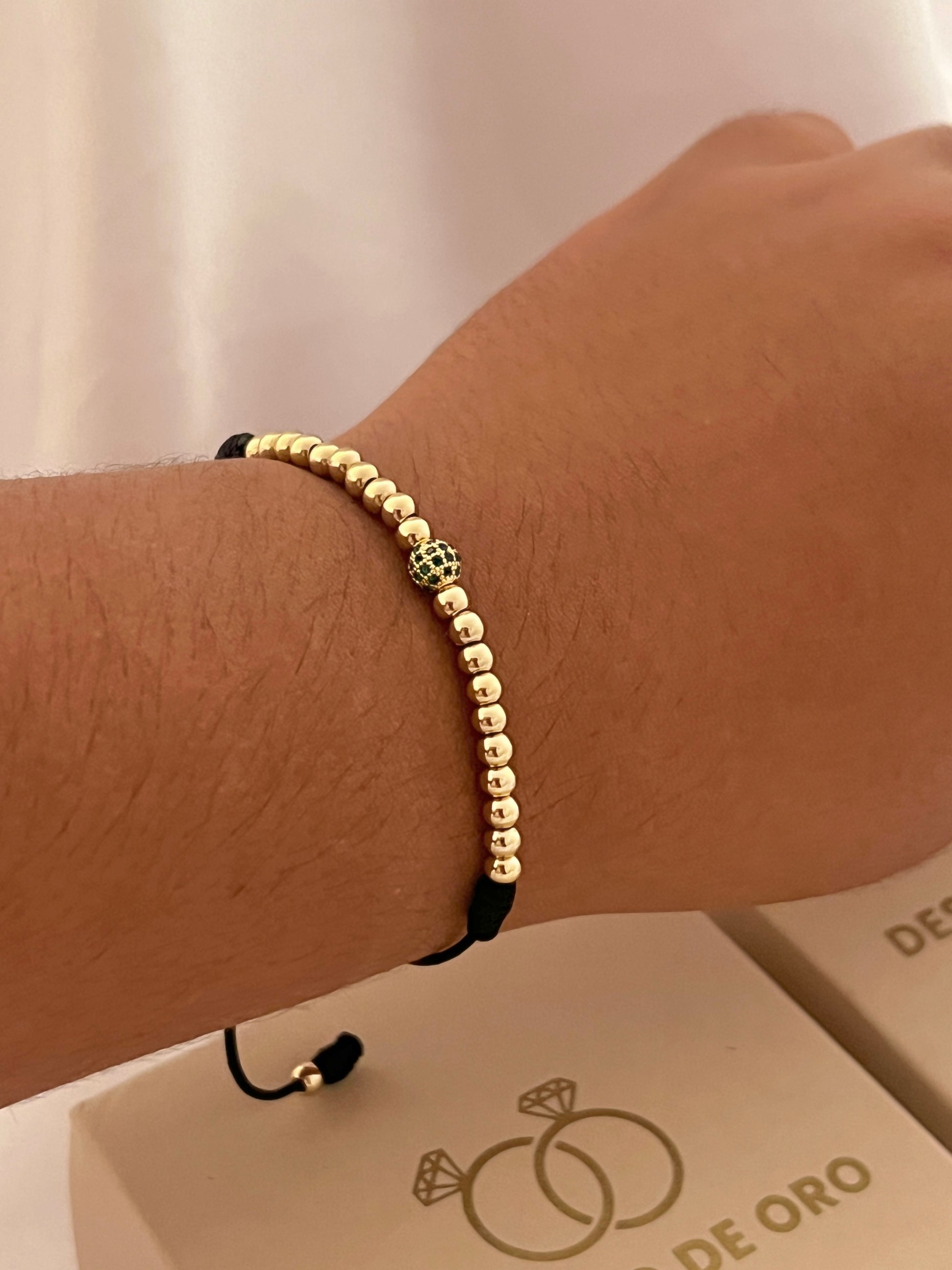 Diseño ajustable con balines lisos #4 y herraje central de bola de fuego verde, en oro laminado 18k representa lujo moderno y autenticidad con presencia destacada.