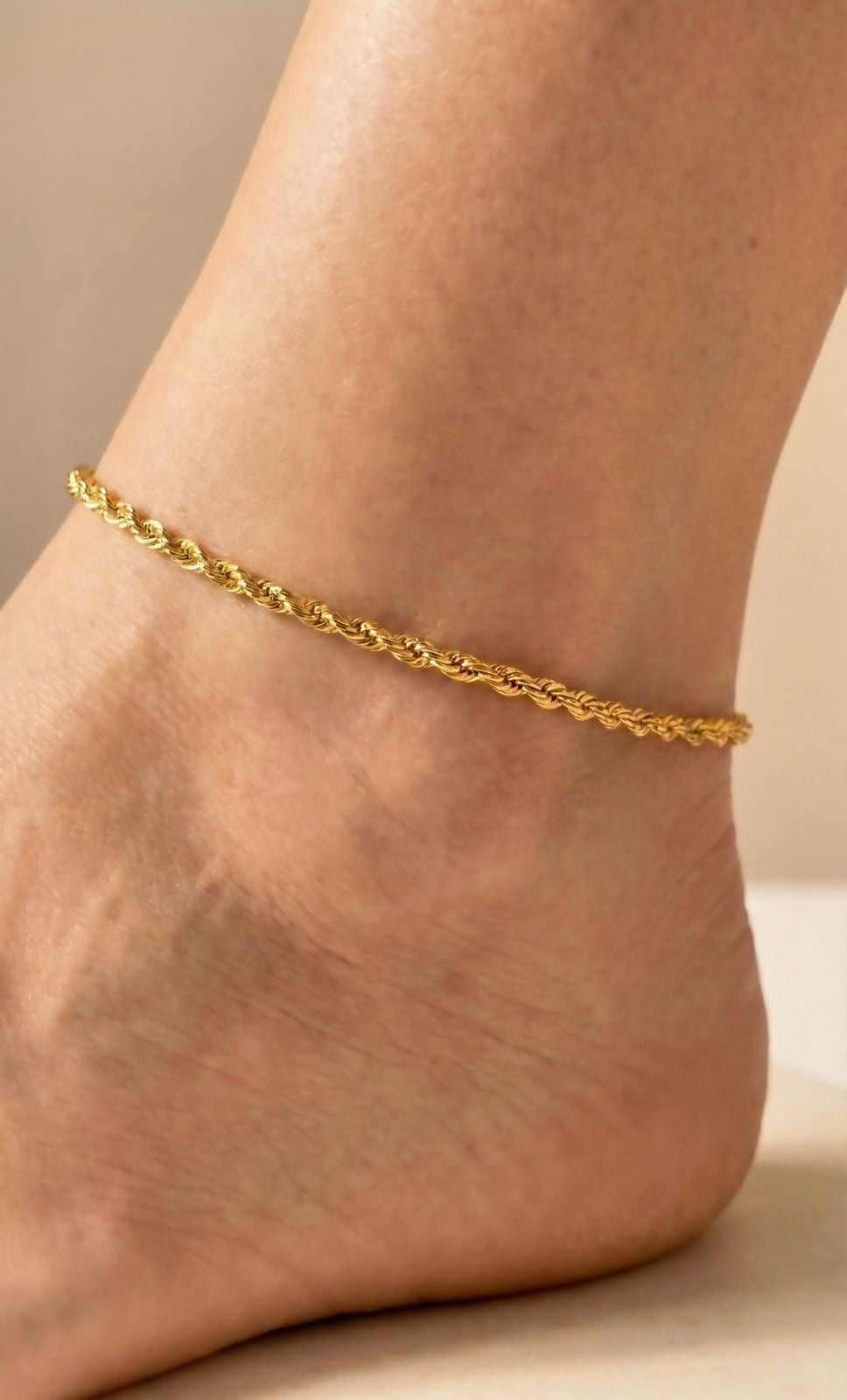 ✨ Una tobillera clásica de tejido lazo, perfecta para realzar tu estilo con un brillo fino y sofisticado.